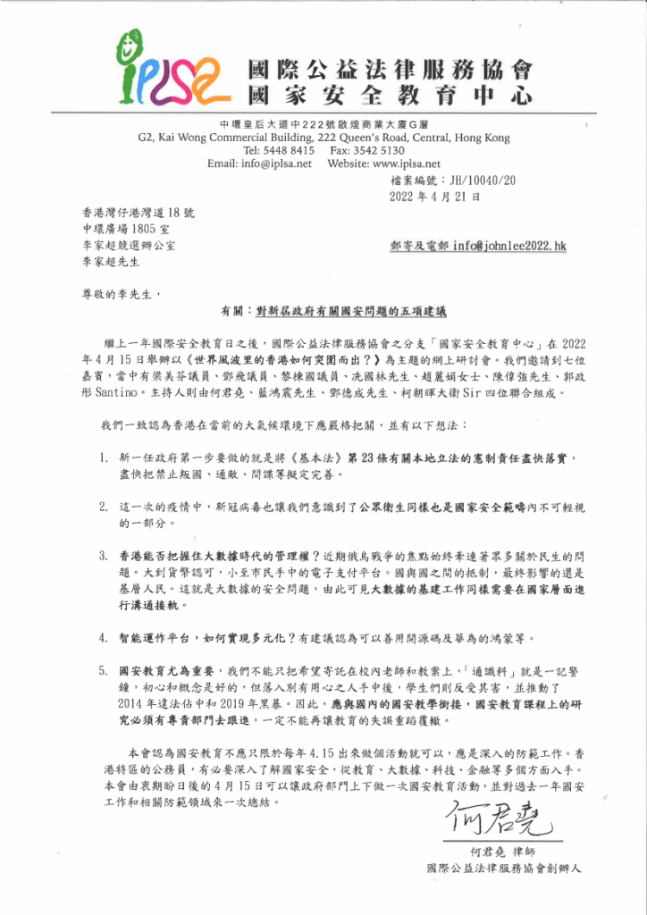 有關:對新屆政府有關國安問題的五項建議